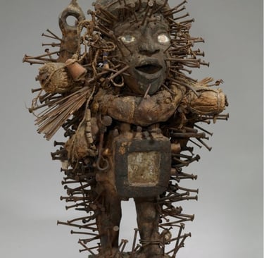 Each piece of metal—each nail and jagged blade—is a physical record of a dispute settled, a vow taken, or a challenge overcome. It is a collaborative sculpture between the artist, the spirit, and the community. It reminds us that our own lives are a 'Power Figure'—we are shaped and strengthened by every 'nail' the world drives into us, turning our scars into symbols of our power.