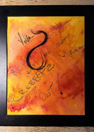 The construction is primal: the focal point is a lock of my own hair, coiled and dark against the heat of the paper. This one is a perfect example of how the creative self, when starved, will use the most available, primitive forms—hair, paper, and the frantic line—to declare its existence. In its strange mix of grief and anger, it is the blueprint for the untamed line I am now ready to explore.