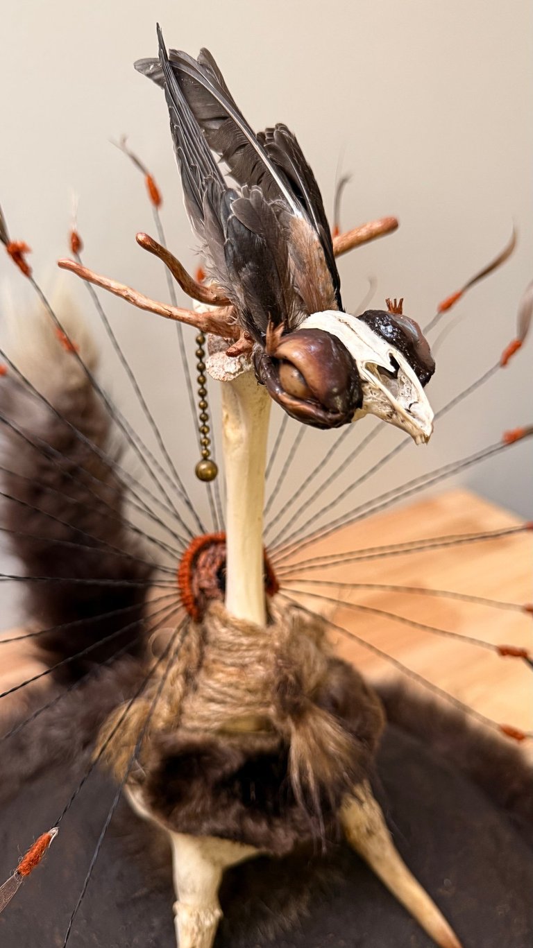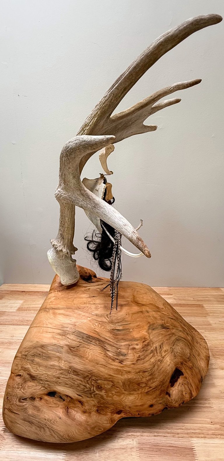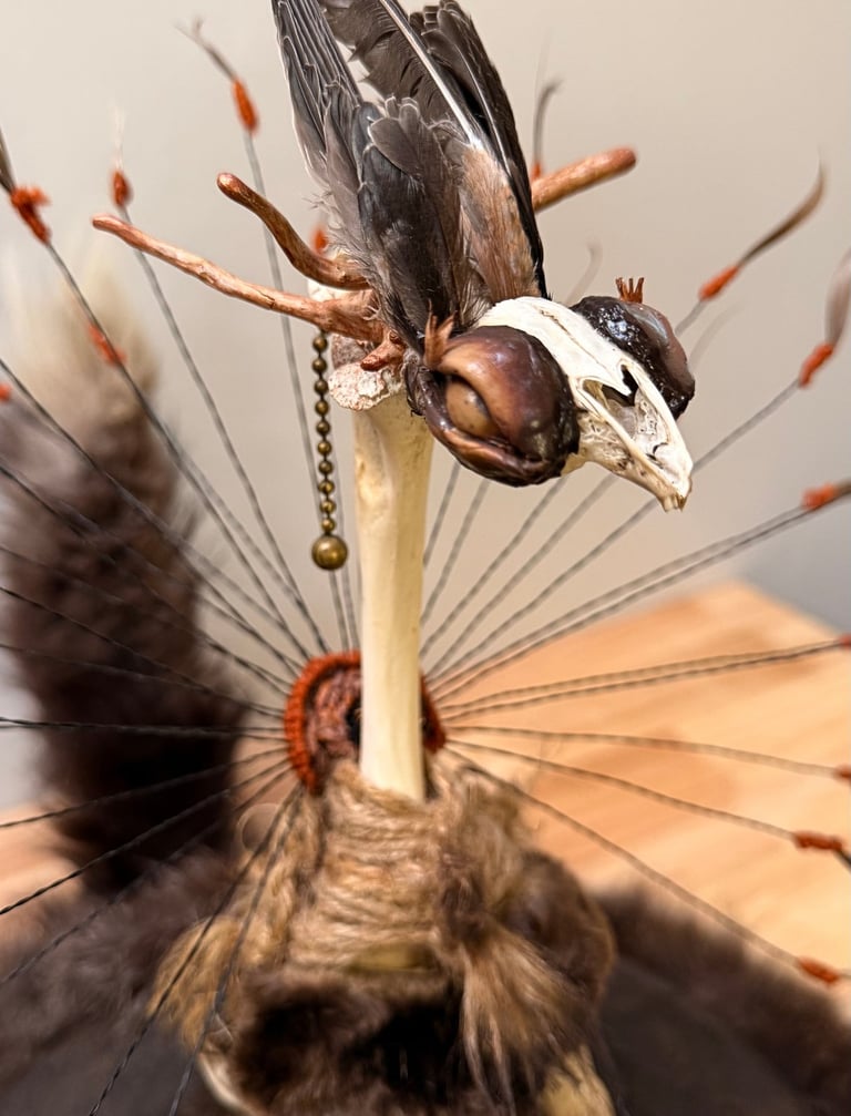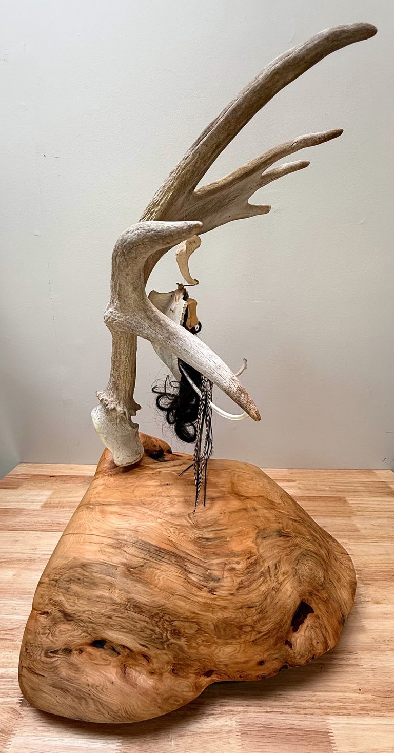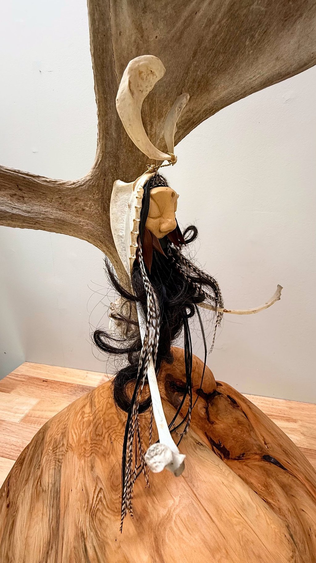 Materials: Elk antler, bald eagle chest bone and furcula, my own hair, deer rib cage bones, rooster tail feathers, monkey tree leaves, leather, brass wire, metal rod, burl, ball chain, paint, bonding agent, polymer clay, monofilament line (fishing line).