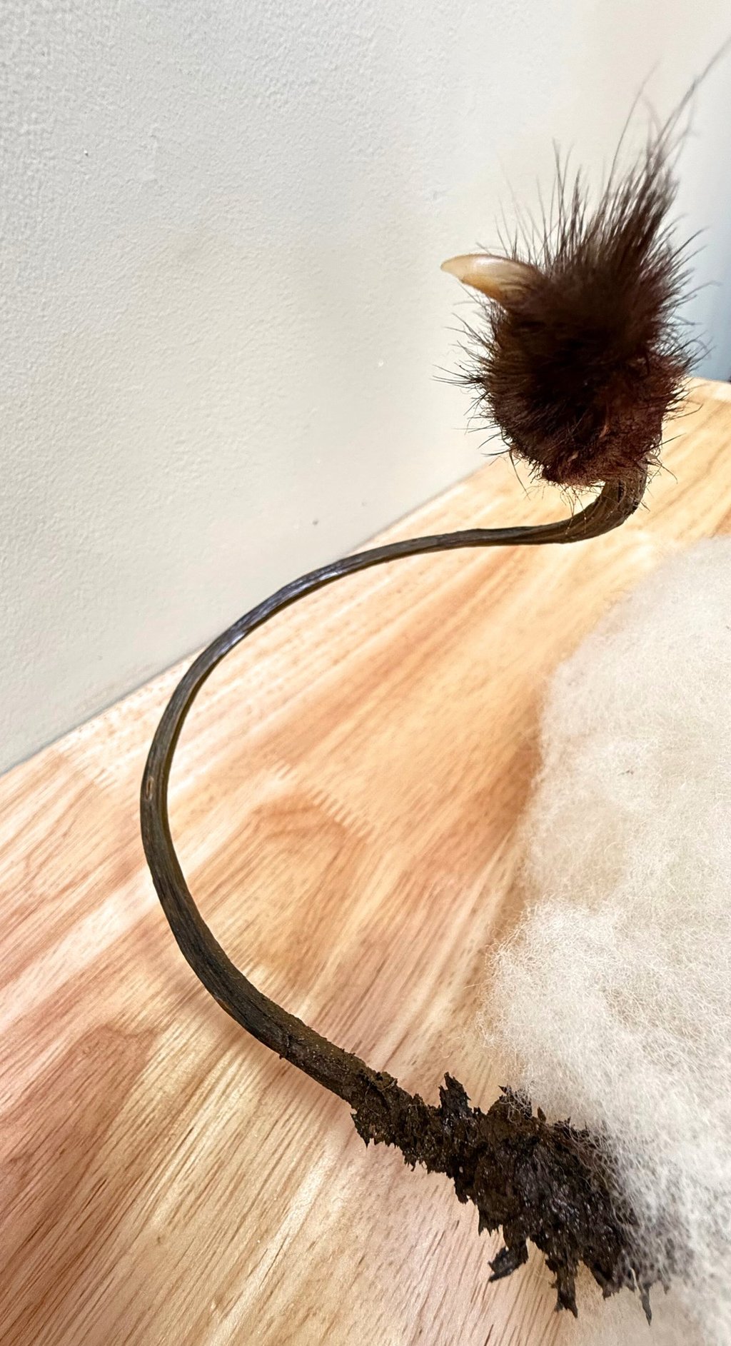 Materials: Moose fur, deer bone, salmon bone, fur, unknown animal bone and claw, cocoon, bird wing, gold leaf, wire, bonding agent, wire, wool, branch, pigment, cement, polymer clay.