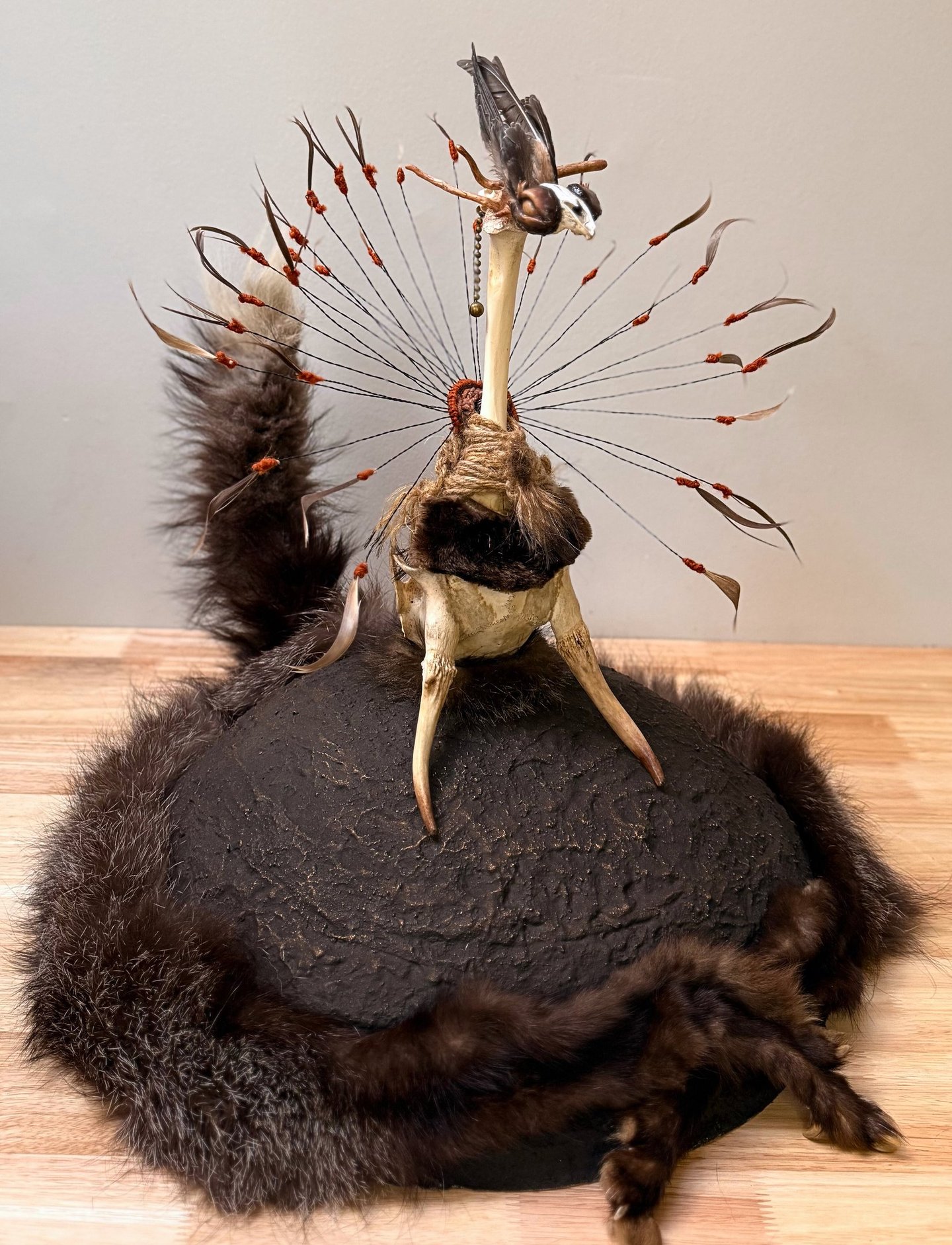 Materials: Fur, deer antler, fish bone, raffia, sawdust, driftwood, leather, eagle feather, gold leaf, wire, wood, bonding agent, seed, wool, pigment.
