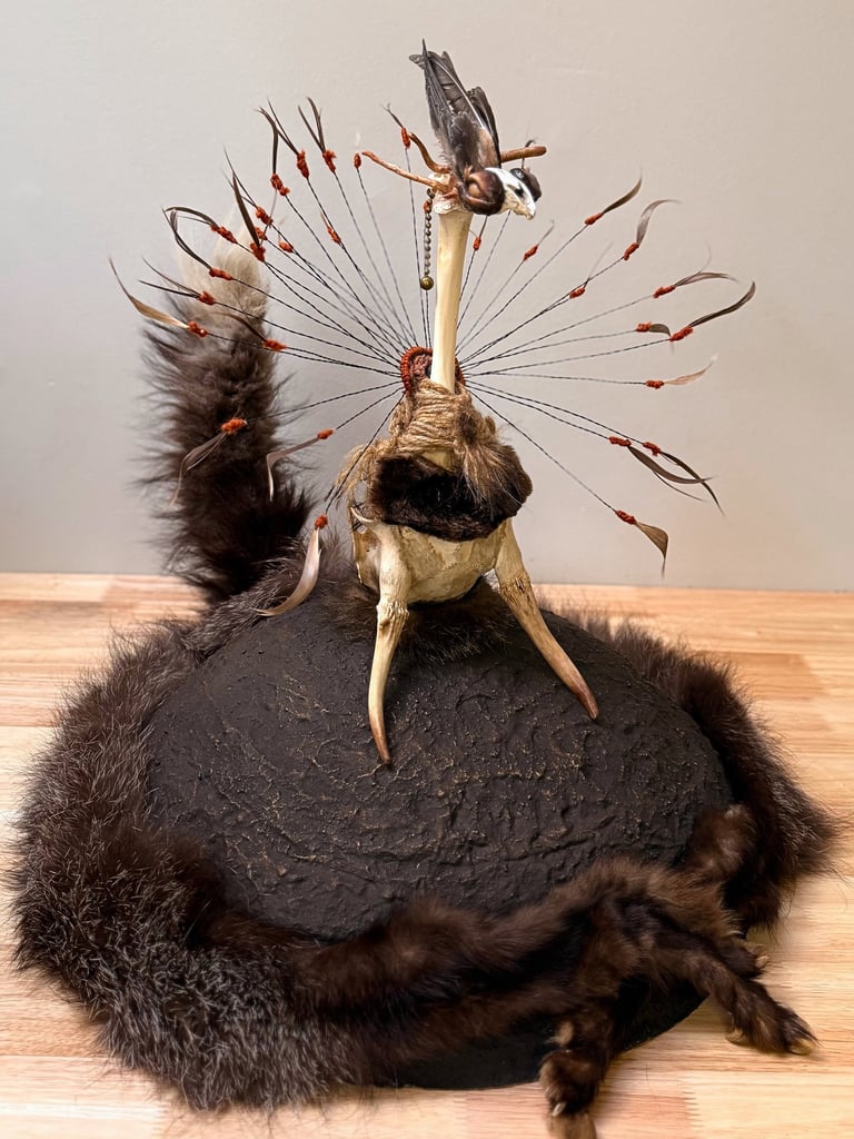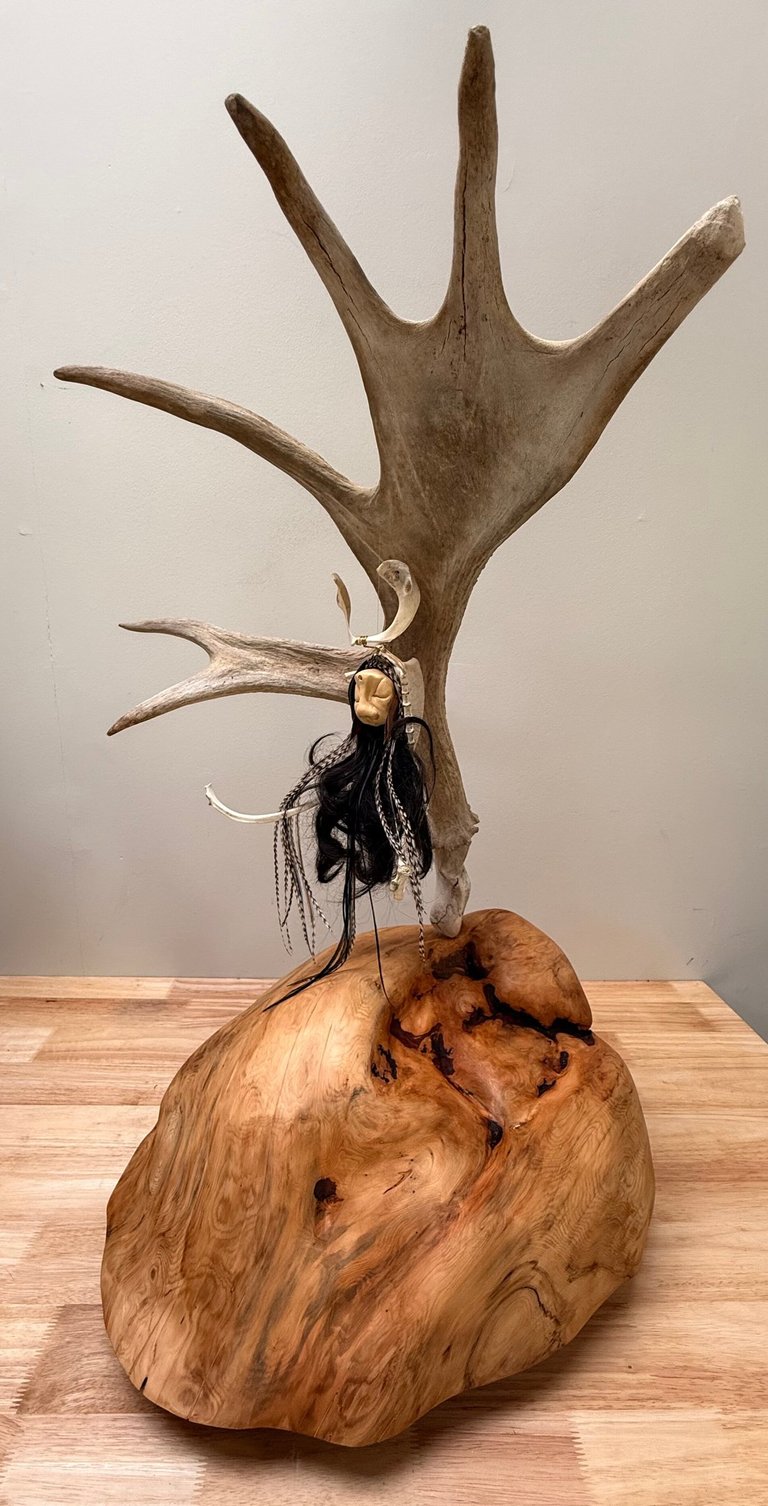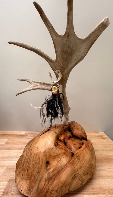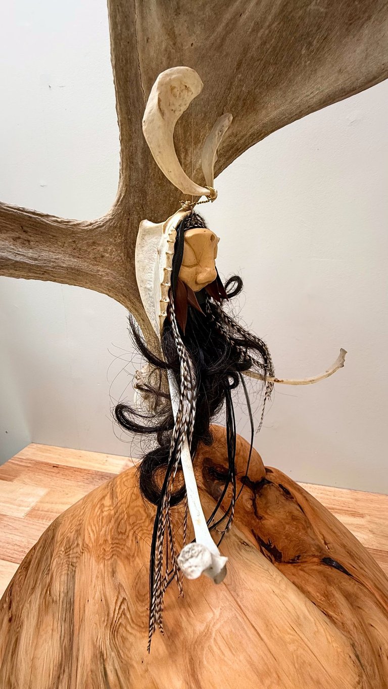 Carved from deer antlers and partial skull, woven with eagle feathers and driftwood antlers, she sits upon fur-lined earth, encircled by a rising tail — a boundary of wild grace.