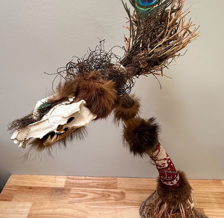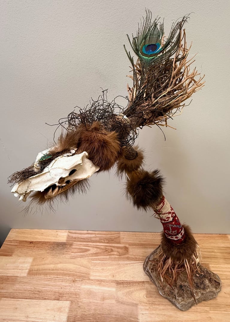 She Who Wears the Wild Flame is one of the figure series shaped by time and tide. Her form is assembled from driftwood, fur, bone, thread, and salmon skin — each element found, held, and eventually called into place. A single peacock feather crowns her — a quiet symbol of fierce beauty, vision, and the unspoken feminine. She wears a jaw made from salmon bone, and long strands of plant material adorned with dog teeth — tokens of ancient strength, protection, and perhaps something primal within. She holds the presence of a shaman — untamed and powerful. Like her sibling sculpture, He Who Carries the Storm, she is a guardian with healing powers. But where he holds the winds, she wears the flame. As well as she could she could clears, transforms, and reveals, she could also destruct when necessary.