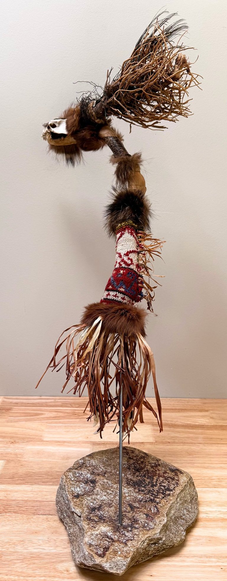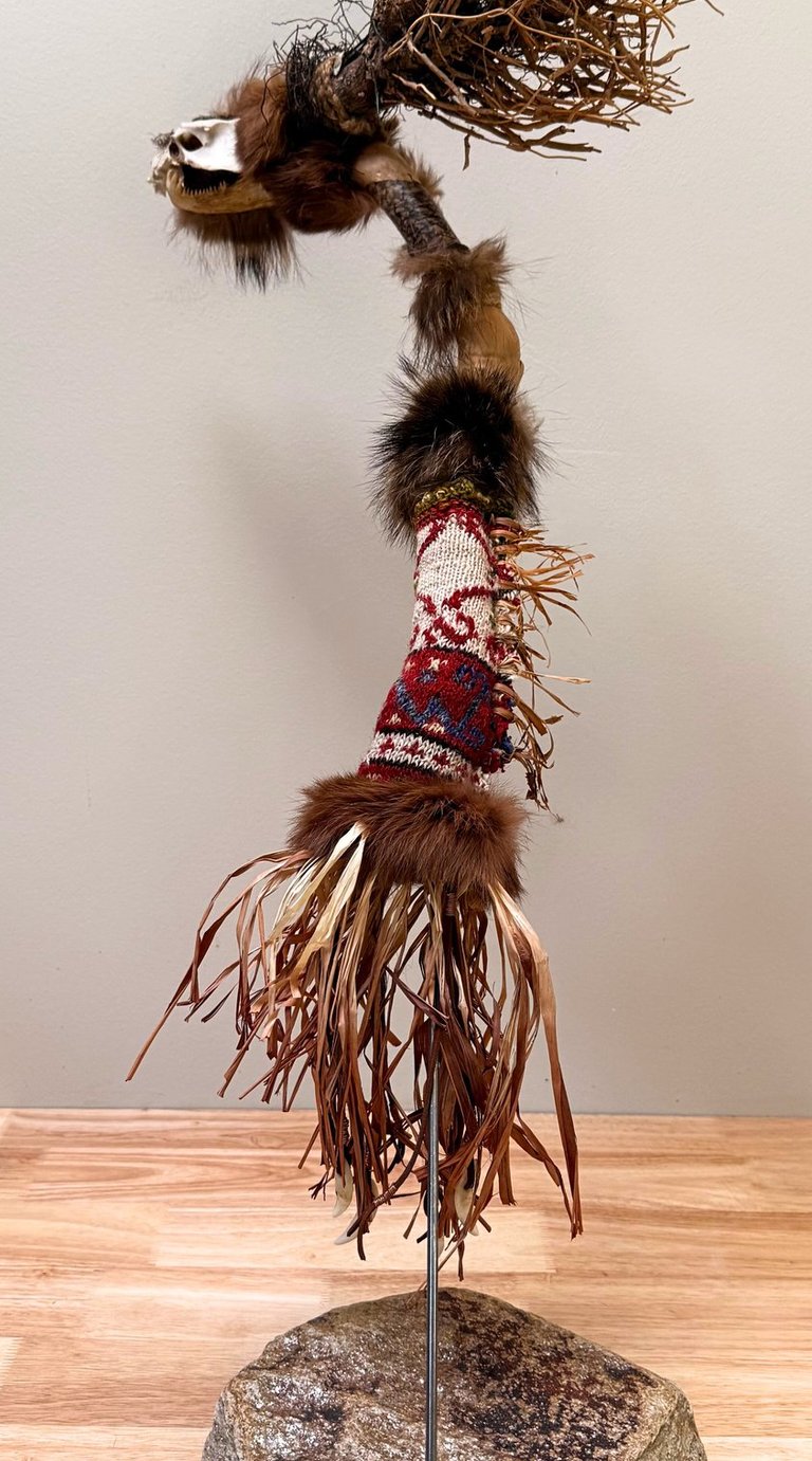 Materials: Salmon skin, fur, dog teeth, salmon jaw bone, possibly rodent skull, seashell fragment, Golden Buprestid beetle, peacock feather, granite, driftwood, root, wool, plant strands, yarn, hemp rope, bonding agent.