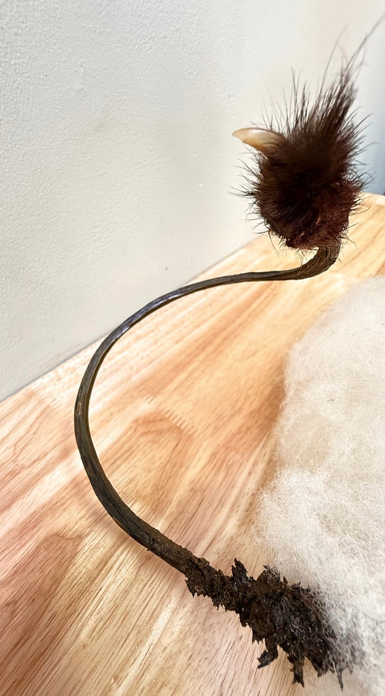 She sits in stillness, suspended in the hush between earth and sky. Made of long strands of human hair, her body remembers her roots — not as place, but as a feeling, as a return. Her arms are deer ribs, her back an eagle’s breastbone — wings once carried by air, now anchoring her in presence. From her crown rises a U-shaped arc of eagle bone — like antlers, like crescent moon, like a portal through which vision flows. Rooster feathers fall through her hair, a tapestry of light and shadow, marking the threshold between sleep and wake. At either side of her head, four monkey tree spines become ornaments — like leaves once sharpened by wind and time.