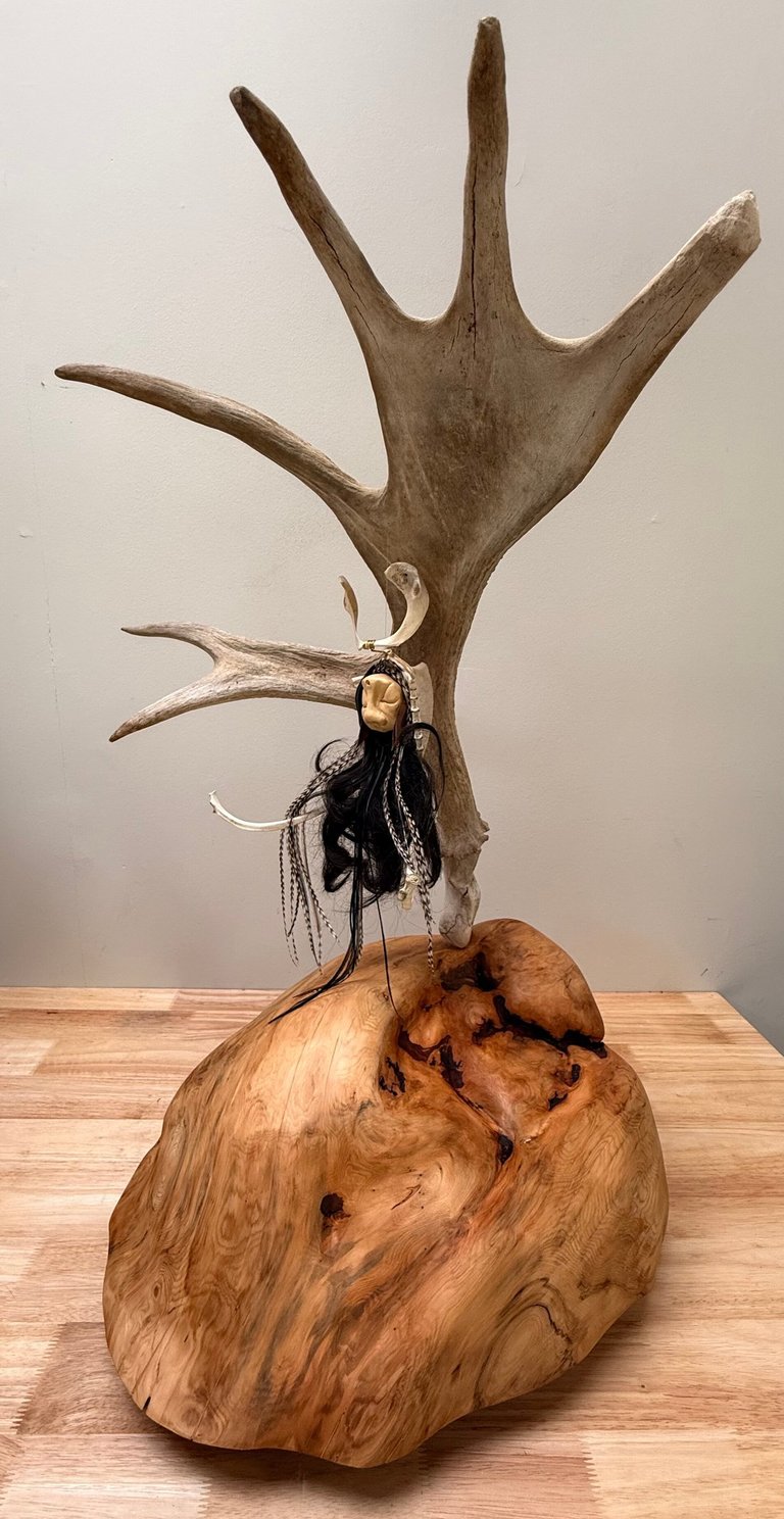 Suspended upon a burl, an elk antler arches behind her like a guardian curve.