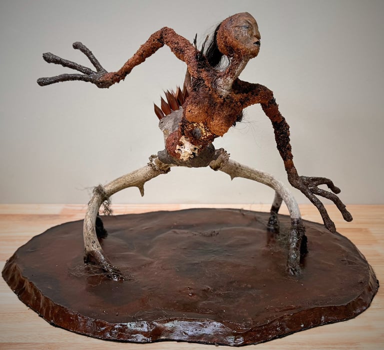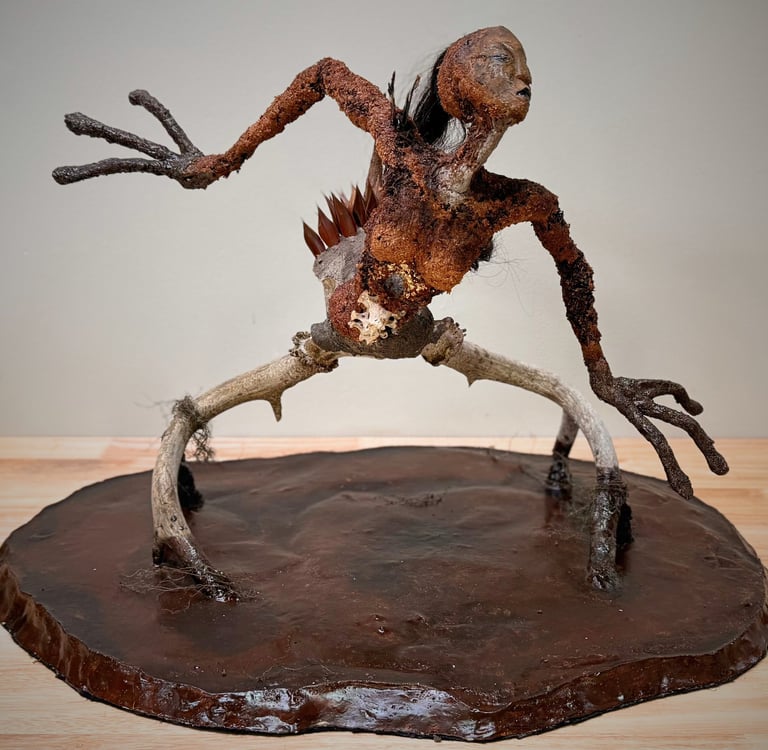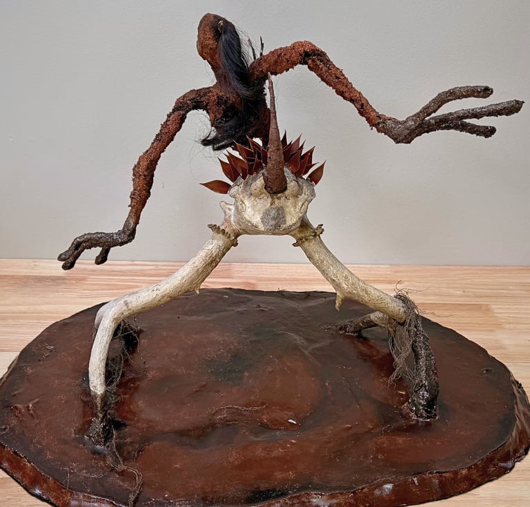 My sculptural work is rooted in deep collaboration with nature. I spend countless hours wandering the woods, gathering materials - moss, leaves, sticks, sap, bones - each processed and held until the moment they reveal their place. I am deeply committed to working with natural materials and strive to minimize the use of chemicals, allowing the forest itself to breath life into my creations.