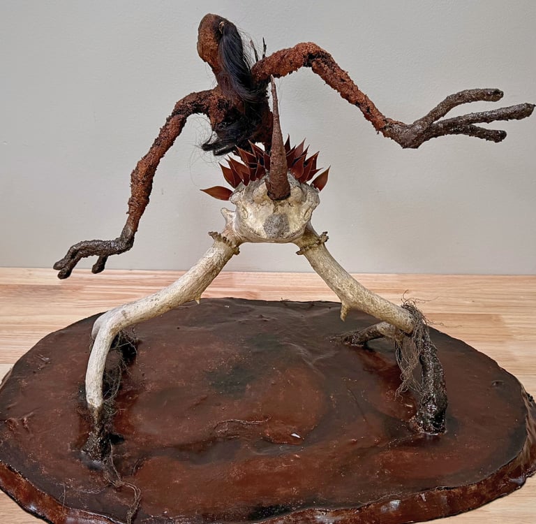 A woman rises from earth where she belongs. Antler legs clutch the wisdom of a shadowed past, breaking through sacred mud. Gold leaves shimmer around a hollow womb of new life. Her lower body armoured with monkey tree leaves- sharp, ancient, and alive.